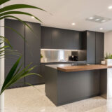 In questa taverna, oltre a progettarne i punti luce ne abbiamo studiato anche i colori, che sono un elemento fondamentale per la buona riuscita dell’ambiente: in questo caso abbiamo optato per tinte calde nelle nuance del beige e del marrone; l’atmosfera risulta così calda ed accogliente che illumina non soltanto il lungo tavolo dall’aspetto vissuto ma avvolge anche le scale e l’angolo cucina.